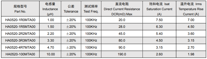 HA0520系列“超大饱和电流”为核心,典型型号如 HA0520-1R0MTA00,饱和电流(Isat)可达 7.5A,温升电流(Irms)7.0A,即使在大电流工况下,仍能保持电感量稳定,避免因电流过载导致的性能衰减。随着电感量增加,电流承载能力呈线性优化,例如电感量 10μH 的HA0520-100MTA00,饱和电流为 2.6A,温升电流 1.98A,满足不同功率等级的设计需求。